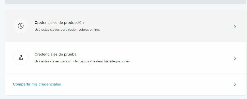 Las credenciales son una serie de datos que actúan como contraseñas para que la plataforma te reconozca y sirven básicamente para conectar tu tienda con MP y así efectuar los pagos por parte de tus clientes. Hay dos tipos de credenciales que podes compartir o utilizar, las de prueba y las de producción. Las primeras sirven para probar la integración, las segundas son las que vas a utilizar para lanzar en producción (activar la pasarela de pago en tu sitio). Estando en el navegador en cual tenes Mercado Pago, accedes a tus credenciales de integración desde el siguiente link: